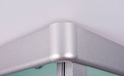 Низкий поддон. Сифон с гидрозатвором. Стекло: 5 мм, переднее - "матовое". заднее - "белое крашеное". Комплектующие: большое овальное зеркало с фацетом, полочка со стаканчиком, смеситель, 3-х режимная душевая лейка на стойке, мыльница, двойные ролики. Модель "СКR" - квадратная кабина со стеклянной крышей, верхним душем с прорезиненными соплами и вентиляционным отверстием.