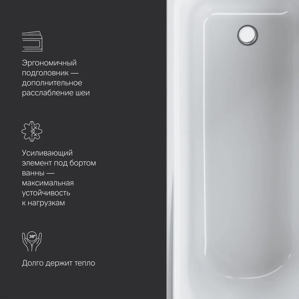 Необычайно вместительна: увеличенный внутренний объем при стандартных внешних габаритах благодаря ультратонким бортам делает процесс принятия ванны комфортным для человека любой комплекции.