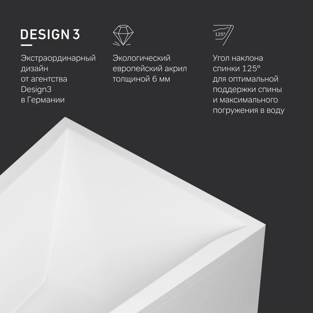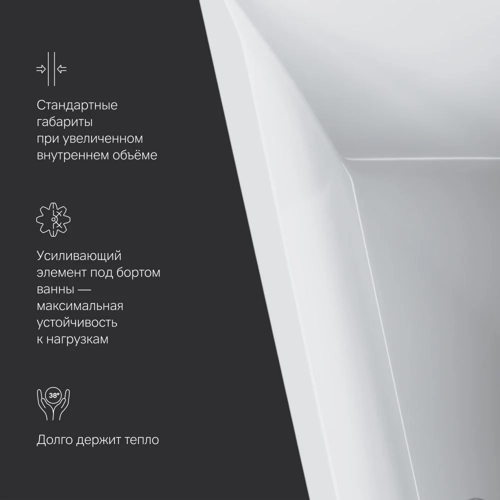 Сохраняя стандартные габариты ванна имеет увеличенный внутренний объём комфортный для человека любой комплектации.