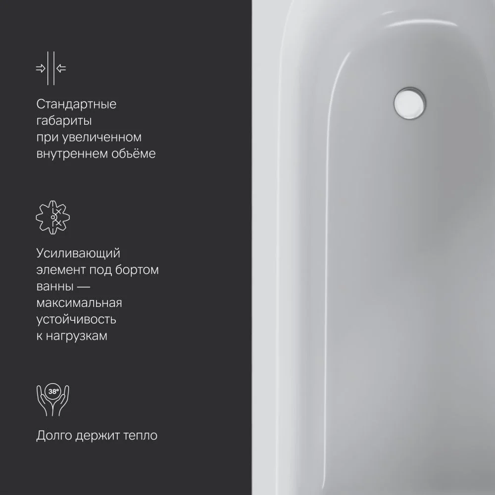 Сохраняя стандартные габариты ванна имеет увеличенный внутренний объём комфортный для человека любой комплектации.