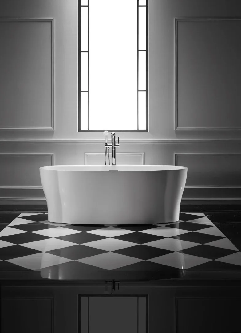 Отдельностоящая, овальная акриловая ванна в комплекте со сливом-переливом цвета хром