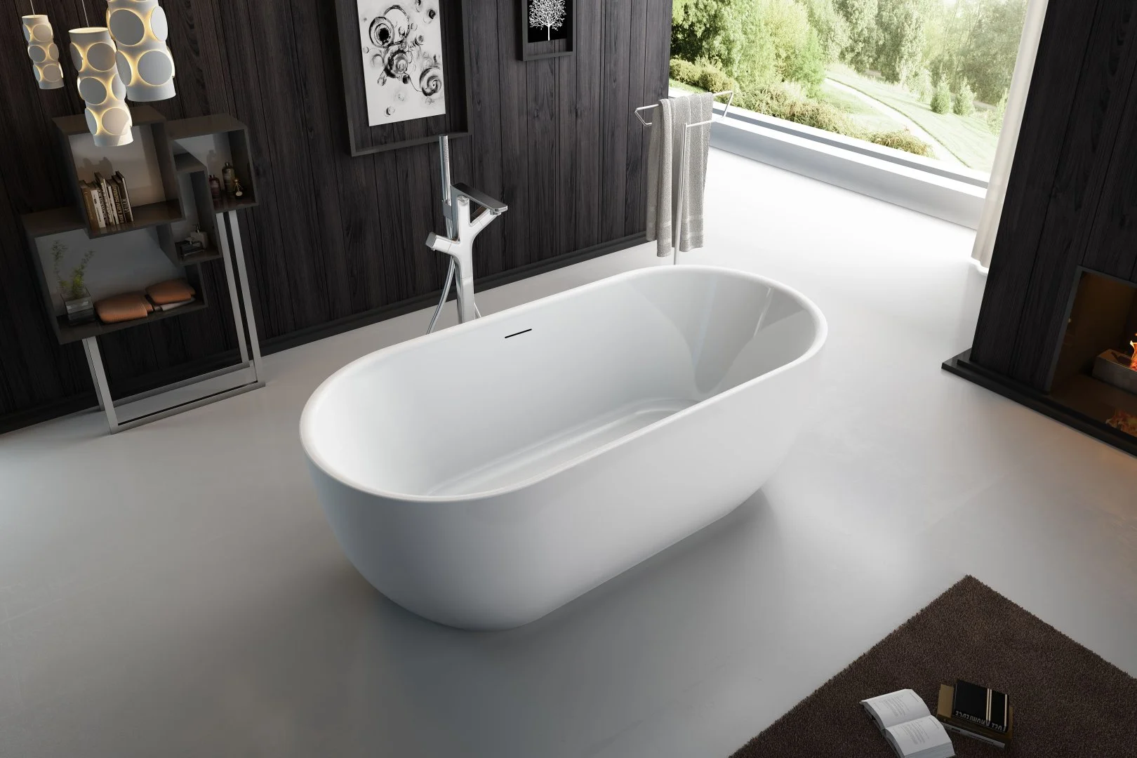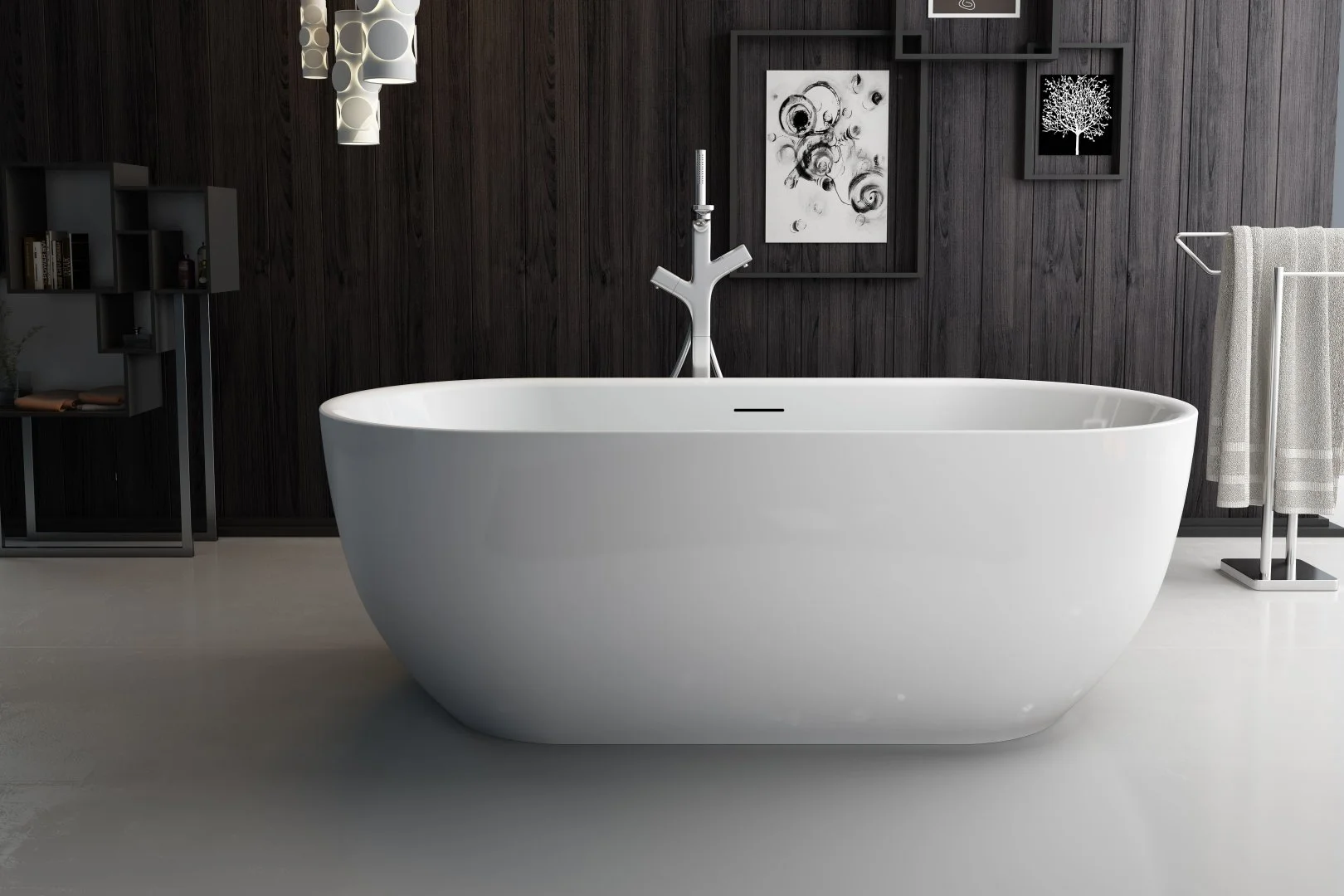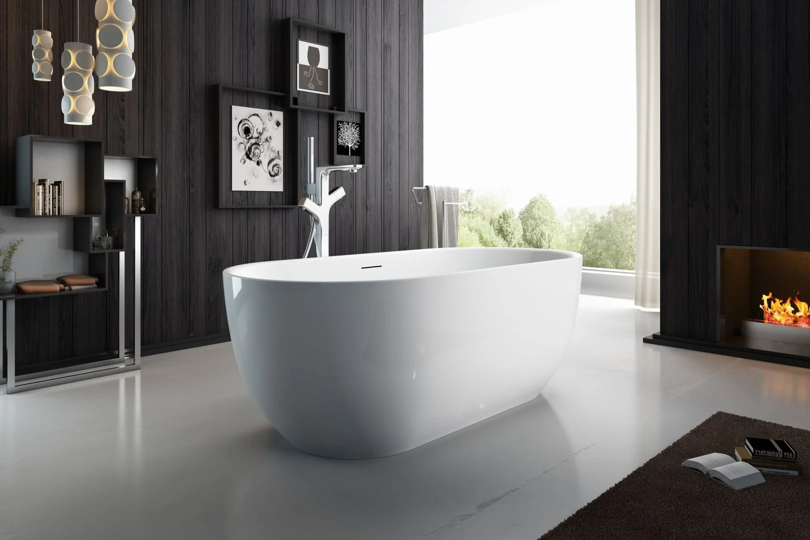 Отдельностоящая, овальная акриловая ванна в комплекте со сливом-переливом цвета хром