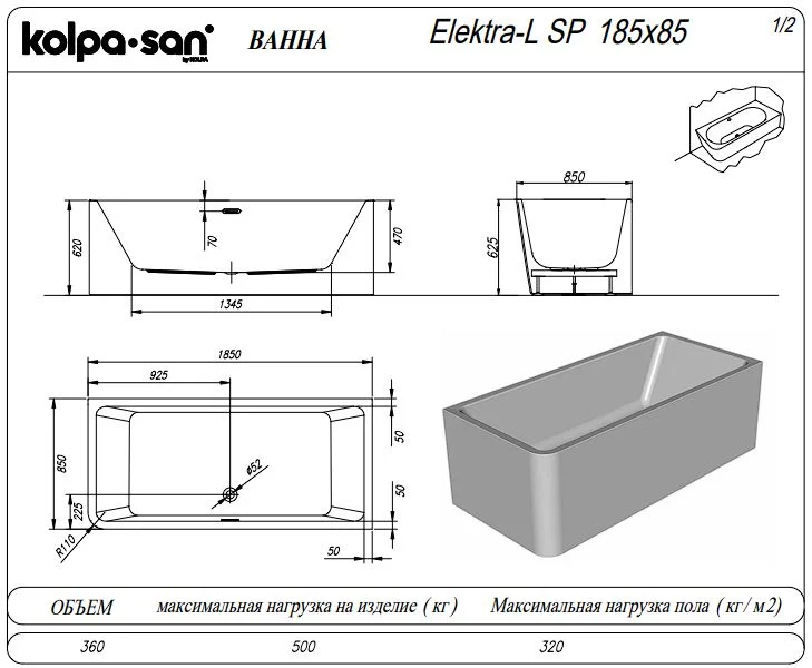 Акриловая ванна Kolpa-San ELEKTRA SP 185x85 L 513470