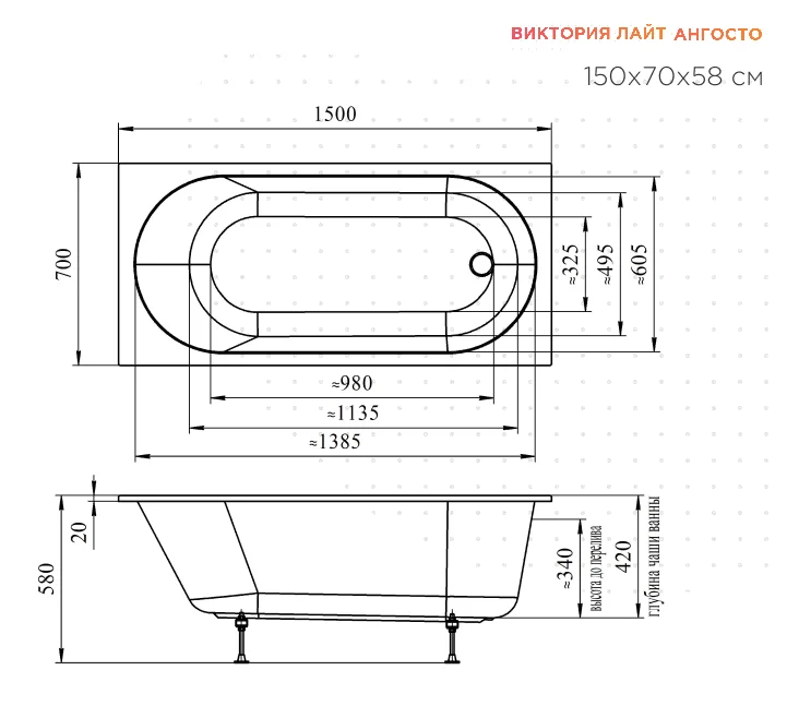Акриловая ванна Radomir Виктория лайт 150х70 Ангосто 1-01-0-0-8-257