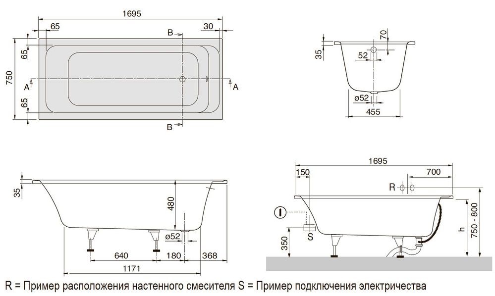 Комплект ножек и слив-перелив не входят в комплект поставки.