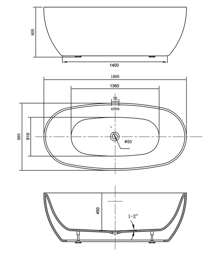 Акриловая ванна Vincea VBT-405-1860, 1860x885x605 белая