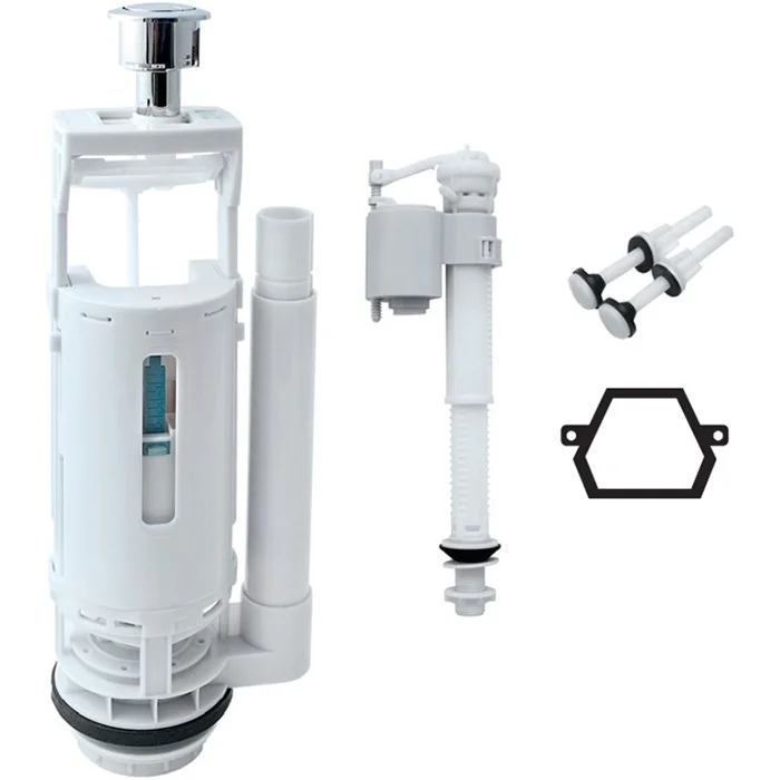 Двухуровневая арматура с нижним подводом воды (тип Б). Комплектация: Трапециевидная резиновая прокладка, пластиковые крепления-болты (2 шт.), паспорт изделия. Все подвижные части находятся внутри защитного корпуса и изготовлены из высококачественного пластика. Гарантия 7 лет.