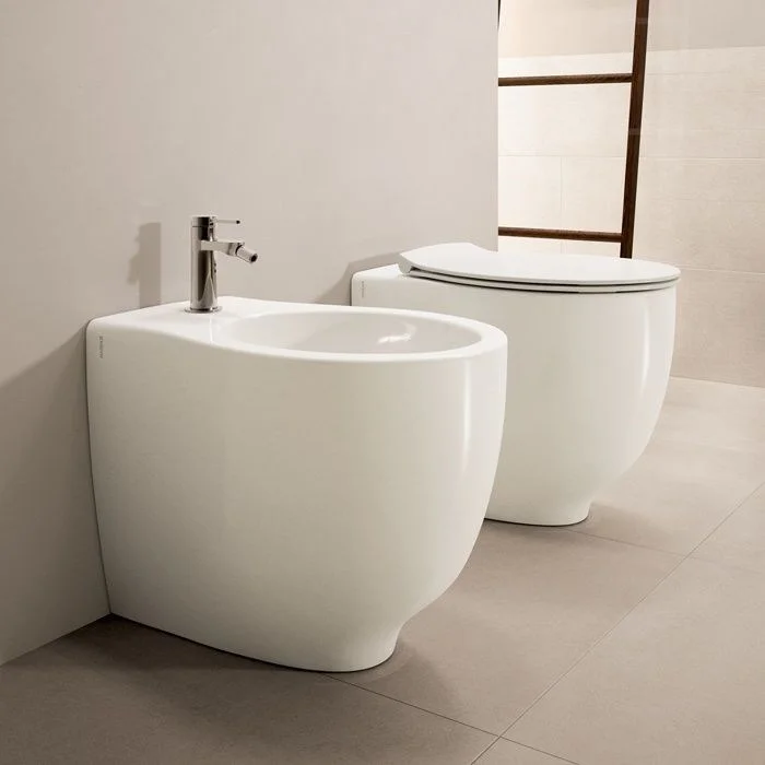 Биде приставное, напольное HATRIA LE FIABE Y1AA01. С отверстием перелива, одно отверстие под смеситель готово. Горизонтальный выпуск, крепеж в комплекте. Производитель Италия "HATRIA".