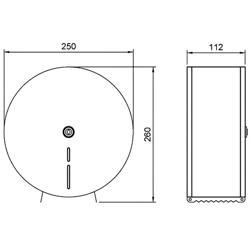 Диспенсер для туалетной бумаги круглый из нержавеющей стали белый. Оборудован антивандальным замком и окошком для контроля наличия туалетной бумаги. Максимальный диаметр рулона 230 мм