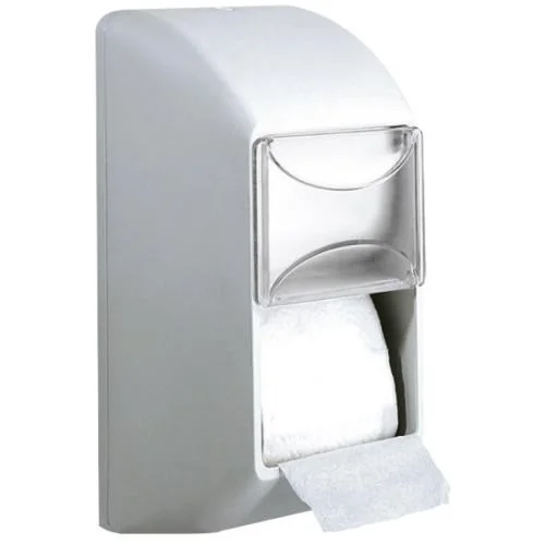 Пластиковый диспенсер для двух рулонов туалетной бумаги на 50 метров имеет смотровое окошко, которое поднимается вверх для загрузки нового рулона