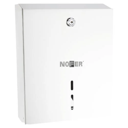 Диспенсер для туалетной бумаги в рулонах 500 м, выполнен из стали белой имеет защитный ключ, окошко для контроля уровня бумаги внутри и фронтальную загрузку рулона бумаги.