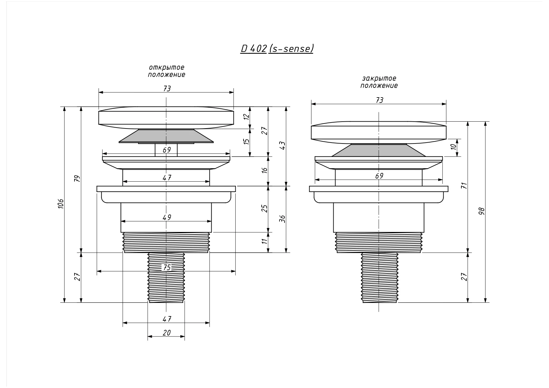 Лаконичный донный клапан модификации Click-Clack. Конструкция изделия спроектирована таким образом, чтобы всего одним нажатием можно было закрыть или открыть сливное отверстие. Это очень удобно и не требует дополнительных усилий.