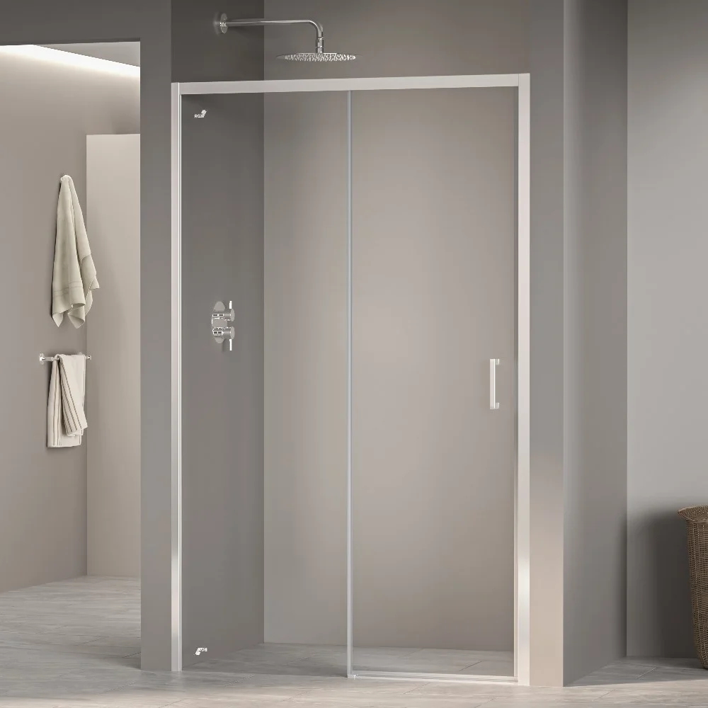 Профиль цвета хром из анодированного алюминия гарантирует прочность и долговечность. Высота двери составляет 1950 мм, а класс утечки 2 предотвращает попадание воды на пол.