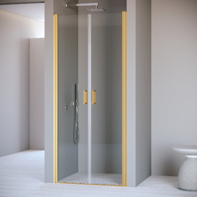 Двух створчатая маятниковая душевая дверь PA-104 с механизмом "Gravity Loop" представлена в популярных цветовых решениях: хром, черный и золото brush.