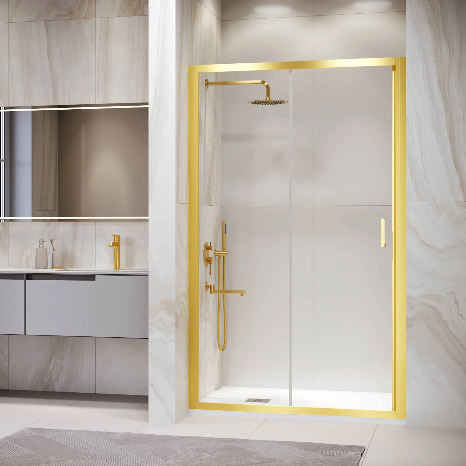 Высота общая двери составляет 1950 мм, а ее конструкция – раздвижная, что позволяет с комфортом использовать пространство в ванной комнате. Дверь имеет магнитный уплотнитель, обеспечивая первый класс герметичности и защищая ванную комнату от брызг воды.