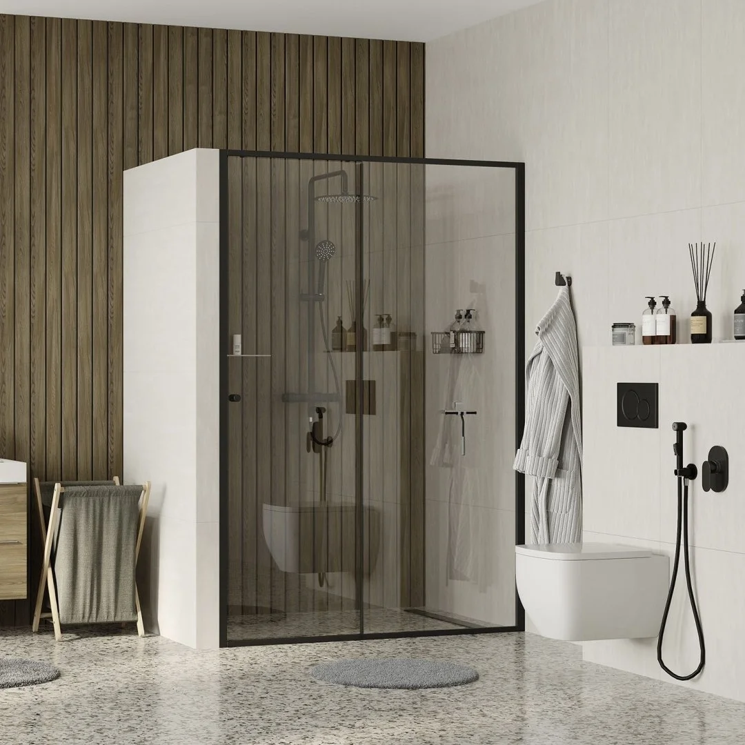 Характеристики: Закаленное прозрачное стекло 6 мм Покрытие стекла WasserSchutz Раздвижной механизм из сплава металлов Анодированный алюминиевый профиль 23 мм Ручка двери из нержавеющей стали Регулирующий профиль двери до 4 мм Механизм легкой чистки Цвет профиля: черный