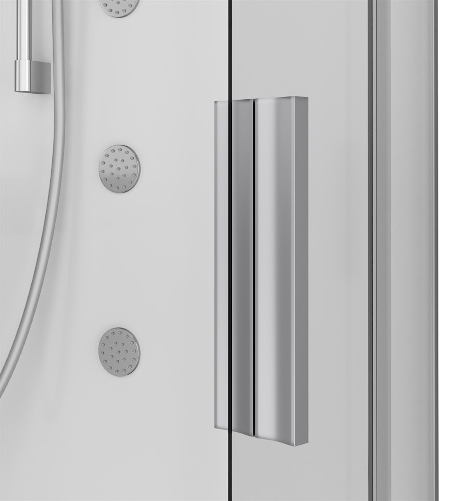 Премиальные решения в каждой детали: компактная вместительная полочка с интегрированным смесителем и переключателем полноразмерное зеркало встроенное в заднюю стенку – необходимое удобство и визуальное расширение пространства внутри кабины.