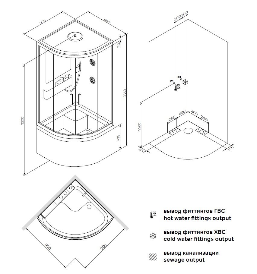 Увеличенная внутренняя площадь: при компактном размере 900х900 мм полезная площадь аналогична кабинам 1000х1000 мм что позволит без помех разместить кабину даже в небольшой ванной и при этом не чувствовать себя стесненным.
