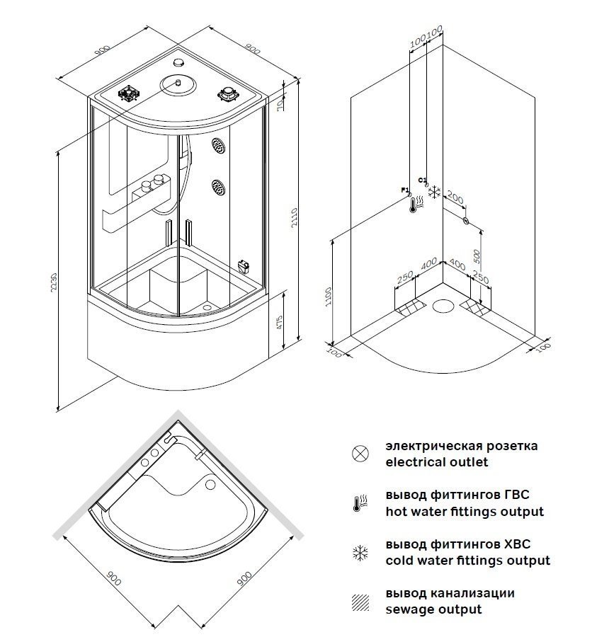 В комплекте также ножки (высота регулировки - до 30 мм) сифон смеситель с переключателем душевой гарнитур (ручной душ на 3 режима - Spray EnerJet Spray + Massage) паровая турецкая баня с электронным управлением (таймер отключения парогенератора через 30 минут максимальная t 60⁰C) вентилятор LED подсветка радио фитодиспенсер (для реализации функции ароматерапии).