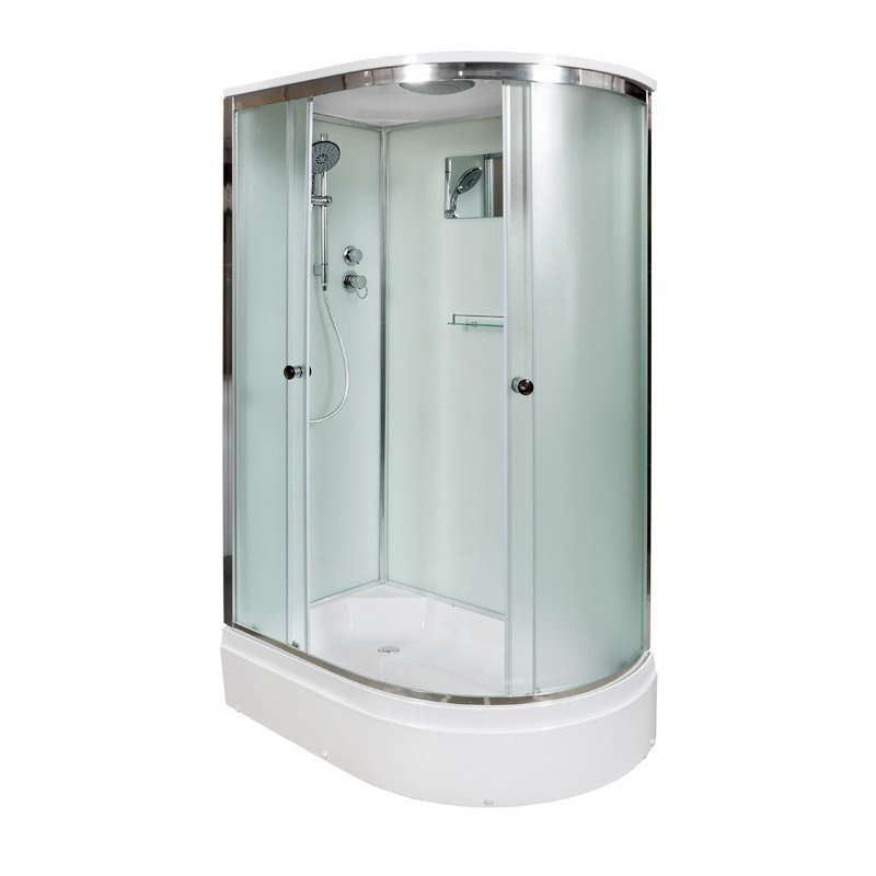 Монтаж душевой кабины осуществляется без использования силикона Латунный смеситель с керамическими картриджами и резьбовыми соединениями 100% акриловый поддон с дренажными отводами, высотой 27 см со съемным экраном усиленный металлическим каркасом с антискользящим покрытием Матовое безопасное закаленное сверхпрочное стекло толщиной 4 мм и антикальциевой обработкой Душевая штанга с регулировкой лейки по высоте и ручная лейка с силиконовыми форсунками диаметром 140 мм с функцией переключения режимов Шланг 1,5 метра Anti-Twist (не скручивается). Поворот шланга 360* Верхний и ручной душ оснащен системой Easy Clean Бесшумные двойные ролики из нержавеющей стали Донный клапан с системой клик-клак с гидрозатвором Зеркало и две стеклянные полки с ограничителем Хромированные ручки