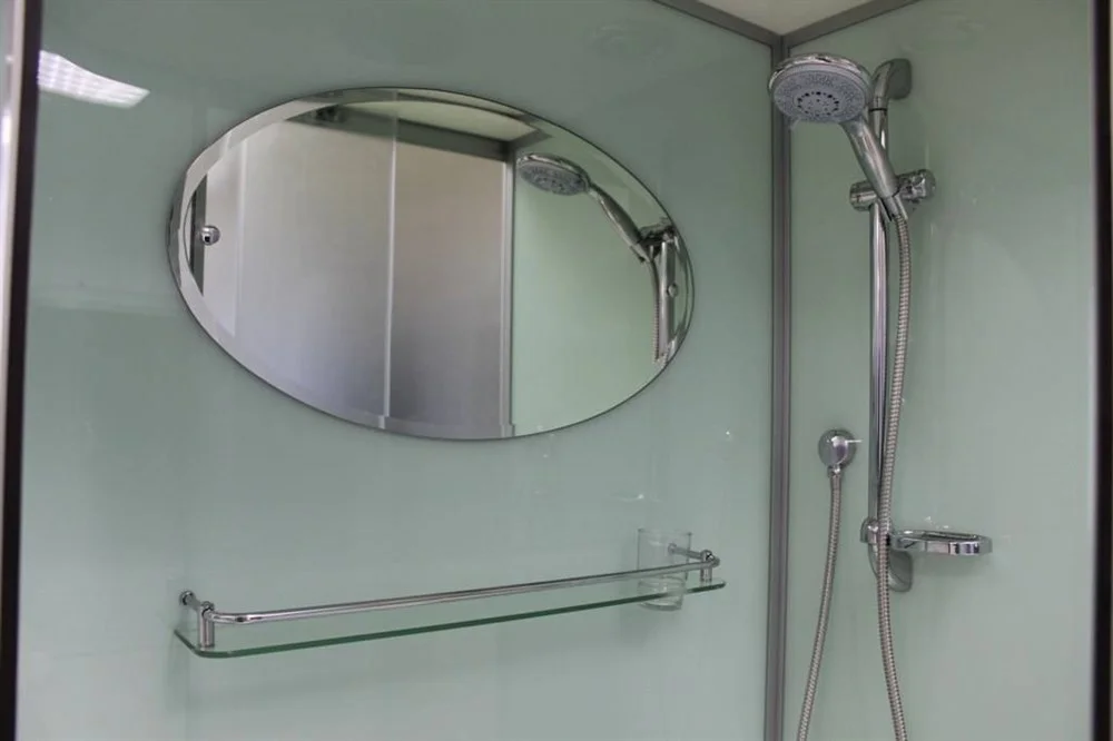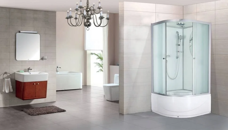 Высокий поддон. Сифон с гидрозатвором. Стекло: 5 мм, переднее - "матовое". заднее - "белое крашеное". Комплектующие: большое овальное зеркало с фацетом, полочка со стаканчиком, смеситель, 3-х режимная душевая лейка на стойке, мыльница, двойные ролики. Модель "СRB" - угловая кабина с высоким поддоном, стеклянной крышей, верхним душем с прорезиненными соплами и вентиляционным отверстием.