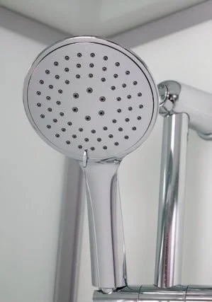 Низкий поддон. Сифон с гидрозатвором. Стекло: 5 мм, переднее - "матовое". заднее - "белое крашеное". Комплектующие: большое овальное зеркало с фацетом, полочка со стаканчиком, смеситель, 3-х режимная душевая лейка на стойке, мыльница, двойные ролики. Модель "СКR" - квадратная кабина со стеклянной крышей, верхним душем с прорезиненными соплами и вентиляционным отверстием.