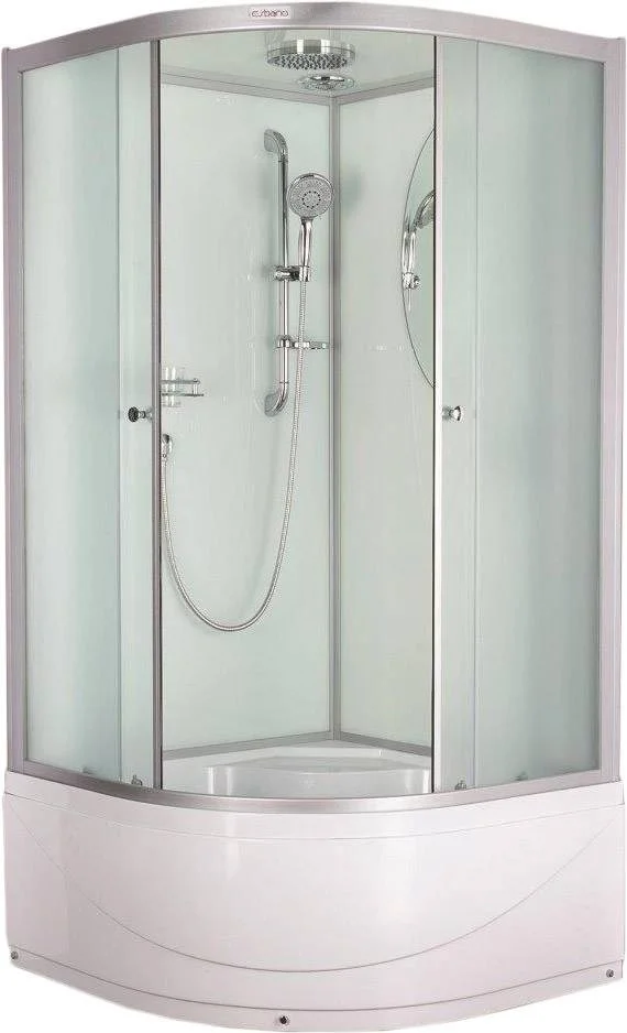Высокий поддон. Сифон с гидрозатвором. Стекло: 5 мм, переднее - "матовое". заднее - "белое крашеное". Комплектующие: большое овальное зеркало с фацетом, полочка со стаканчиком, смеситель, 3-х режимная душевая лейка на стойке, мыльница, двойные ролики. Модель "СRB" - угловая кабина с высоким поддоном, стеклянной крышей, верхним душем с прорезиненными соплами и вентиляционным отверстием.