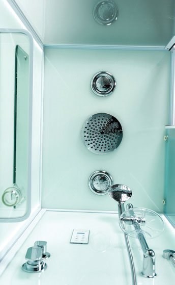 Низкий поддон. Сифон с гидрозатвором. Стекло: 5 мм, переднее - "матовое". заднее - "белое крашеное". Встроенная LED подсветка. Профиль: алюминий. Цвет: БЕЛЫЙ. На кабинах установлены: панель управления, вытяжной вентилятор, верхний душ с резиновыми соплами, FM радио. Комплектующие: стеклянная крыша, большое зеркало с фацетом, полочка со стаканчиком, смеситель, 3-х режимная лейка на стойке, мыльница, двойные ролики. Модель: "СКR" - квадратная.