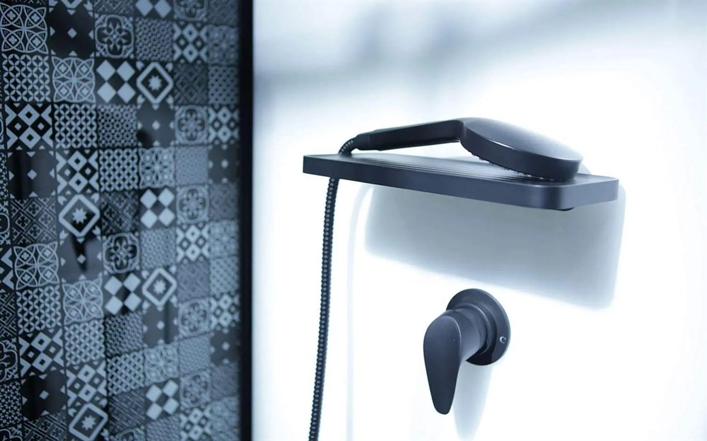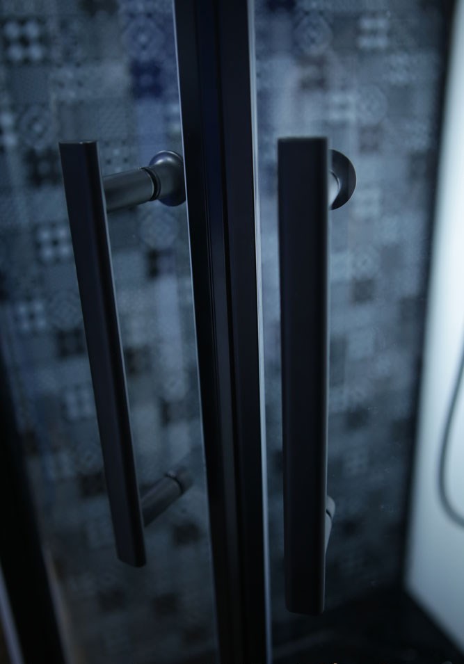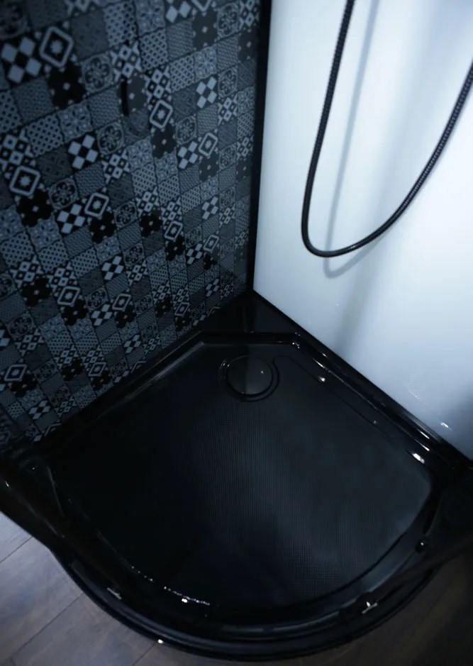 1. Поддон из ЧЁРНОГО акрила с бортиками по периметру - для безсиликоновой сборки. 2. Задние стенки: "стекло БЕЛОЕ крашеное и стекло ДЕКОРИРОВАННОЕ" с профилями для "замковой" фиксации. 3. Передние стёкла - прозрачные ("easy clean"). 4. Полочка для шампуня. 5. Левый и правый вариант сборки.