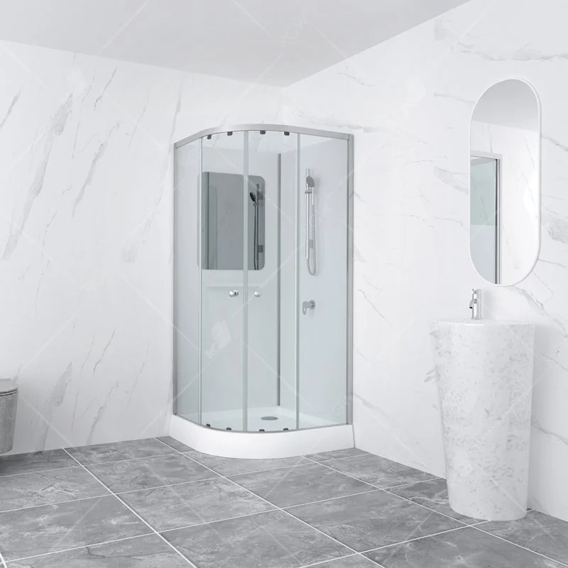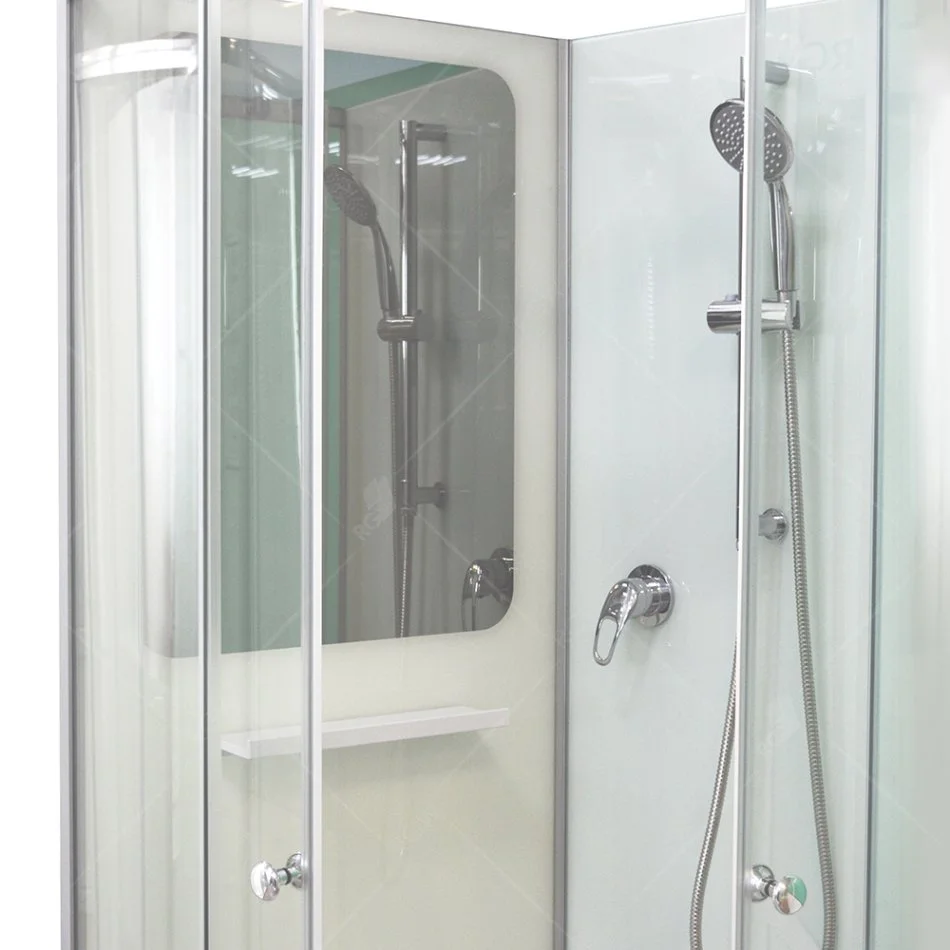 Без силиконовая сборкаАлюминиевый профиль Сатин (Матовый хром)5мм прозрачное закаленное стекло двериБелое окрашенное закаленное стекло толщиной 5мм для задней панели (одна панель с зеркальным покрытием)Встроенное зеркало1- режим переключатель: ручной душ со штангой и душевой шланг 1,5 м (Смеситель, ручной душ, стойка, шланг)Верхние двойные и нижние одинарные роликиАлюминиевая полкаХромированная ручкаДушевой поддон с 90 мм сифономДве раздвижные двериПоддон выдерживает вес до 150 кг