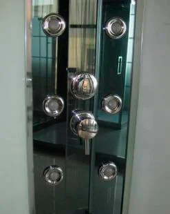 - комплектация: сенсорная панель управления,FM радио,подключение к СD,телефону; турецкая баня(хамам),ароматерапия,озонатор; гиромассаж спины (6 джет); верхний душ; ручная лейка на регулируемой по высоте штанге; электр. вентиляция