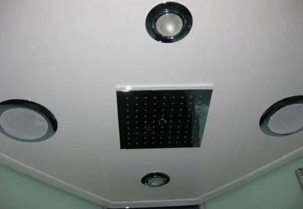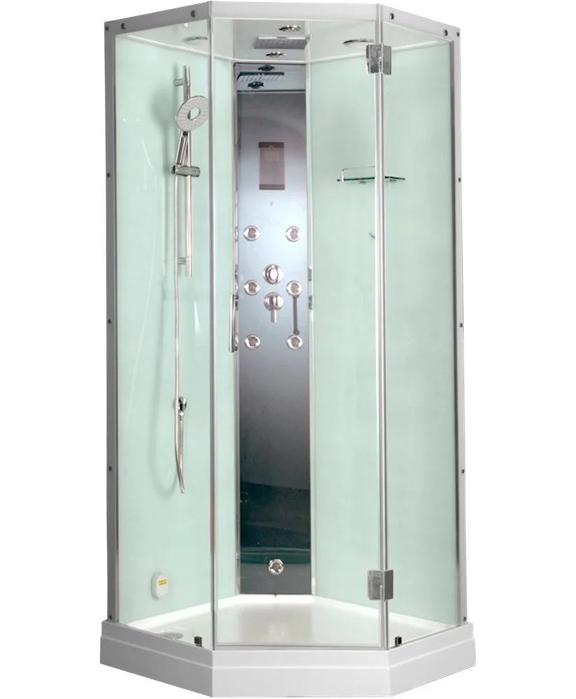 - комплектация: сенсорная панель управления,FM радио,подключение к СD,телефону; турецкая баня(хамам),ароматерапия,озонатор; гиромассаж спины (6 джет); верхний душ; ручная лейка на регулируемой по высоте штанге; электр. вентиляция