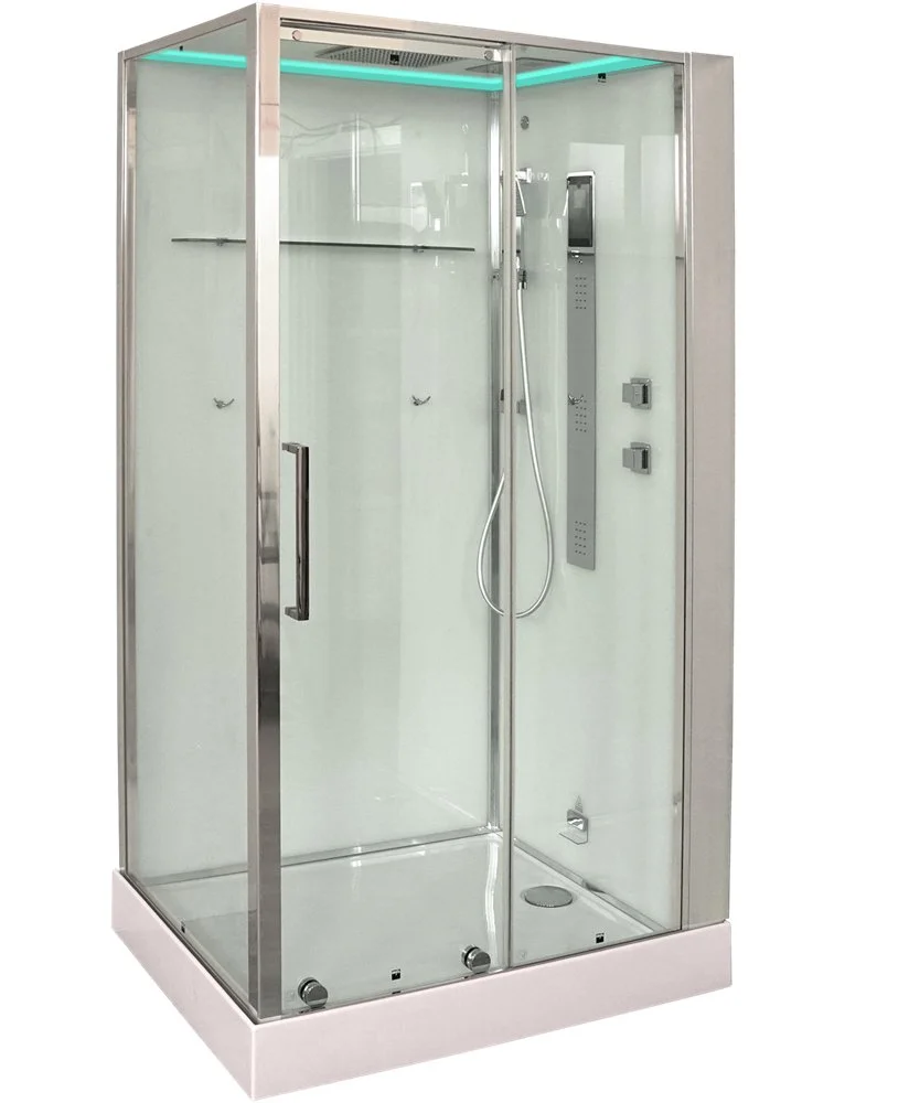 - комплектация: сенсорная панель управления, FM радио; турецкая баня (хамам), ароматерапия, озонатор, хромотерапия; гидромассаж спины; верхний душ; ручная лейка на регулируемой по высоте штанге; электр. вентиляция