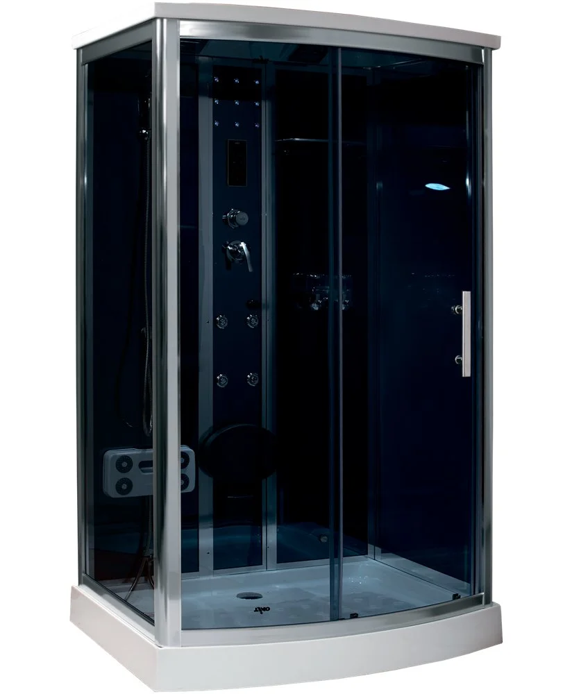 - комплектация: сенсорная панель управления,FM радио; стеклянная полочка; электр. вентиляция; подсветка верхняя и боковая; однорычажный четырехрежимный смеситель гидромассаж спины (6 джет); гидромассаж ног; верхний душ; ручная лейка на регулируемой по высоте штанге; откидное сиденье с допустимой нагрузкой не более 50 кг