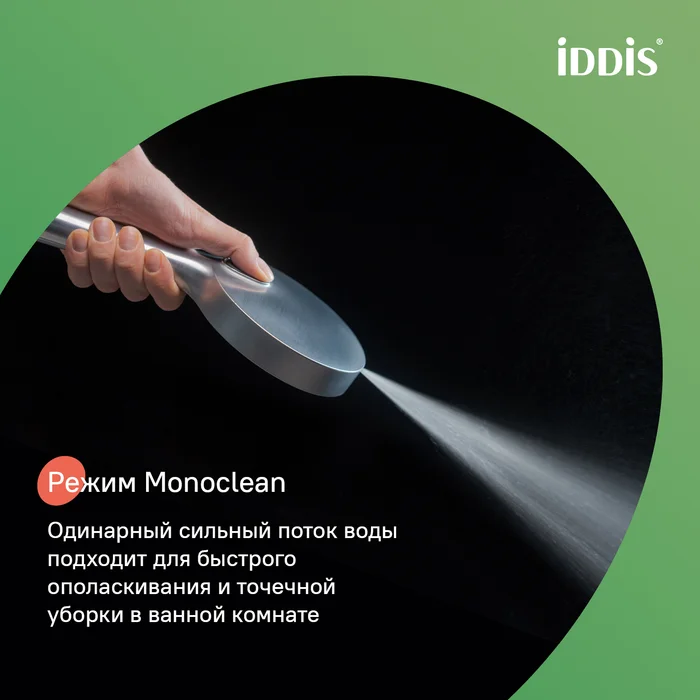 Кнопка на внешней стороне лейки включает отдельный режим MonoClean – мощную струю из торцевой части лейки, удобную для бытовых задач типа ополаскивания ванны или душевой кабины.