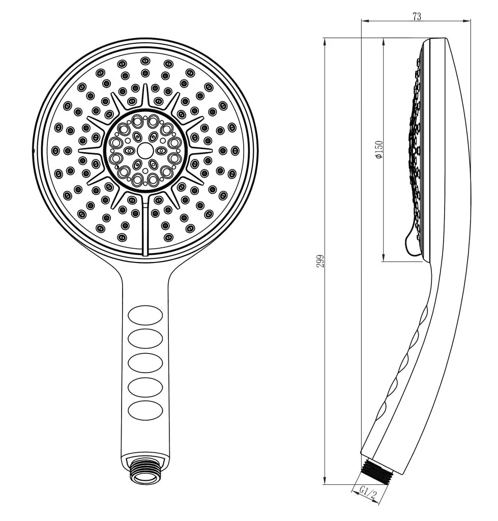 • 6-функциональная Ø150 мм. Режимы: распыление, массаж, брызги шампанского, распыление и массаж, распыление и брызги шампанского, эко-режим