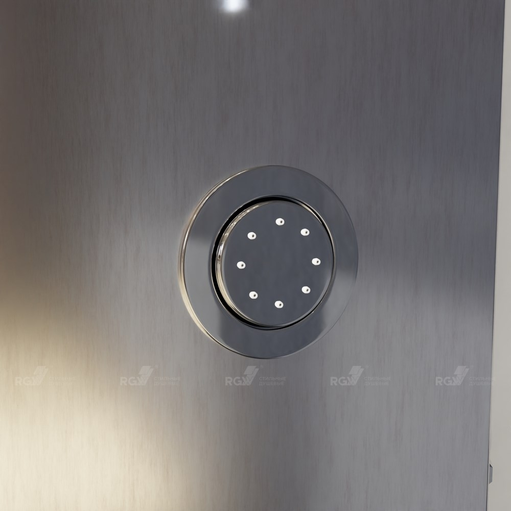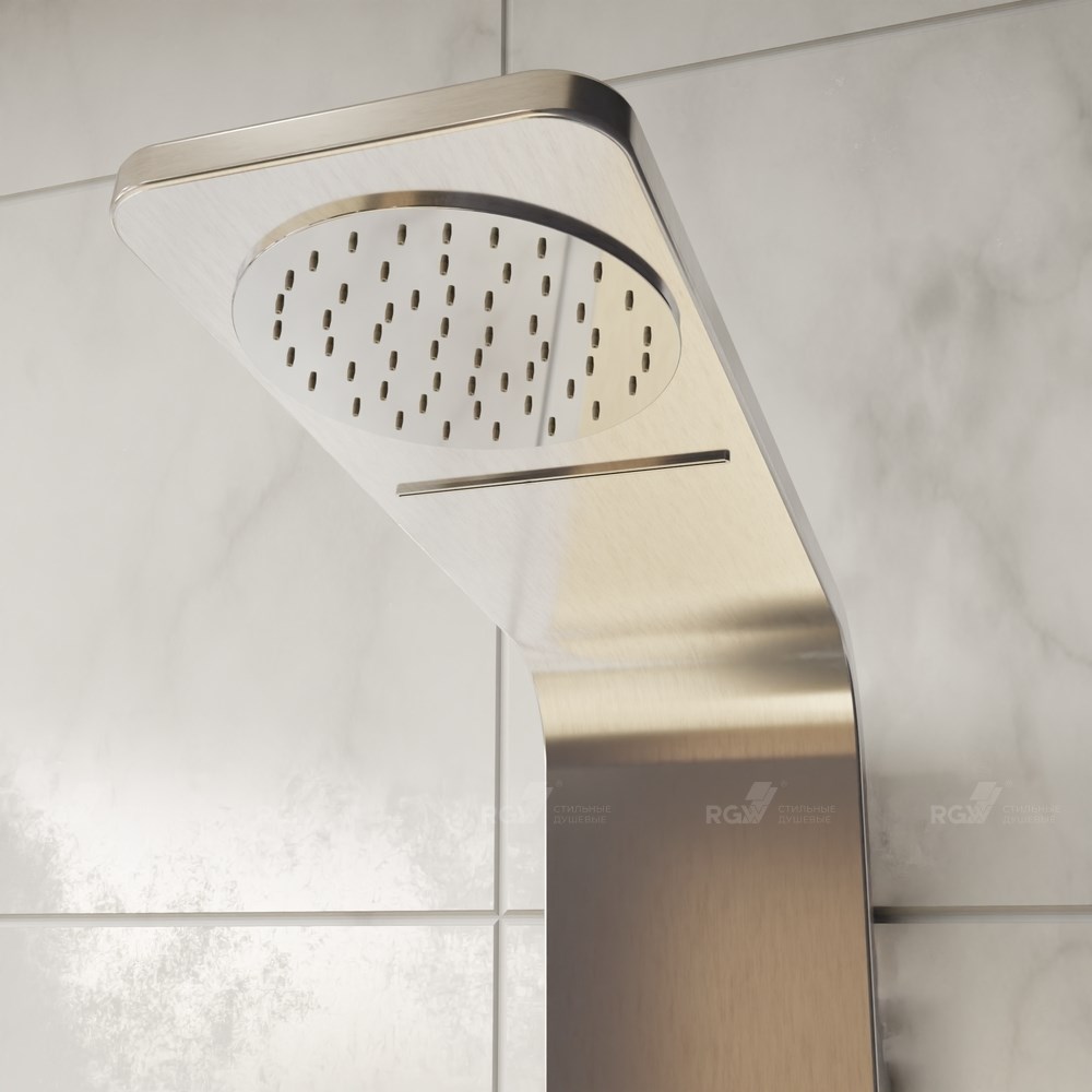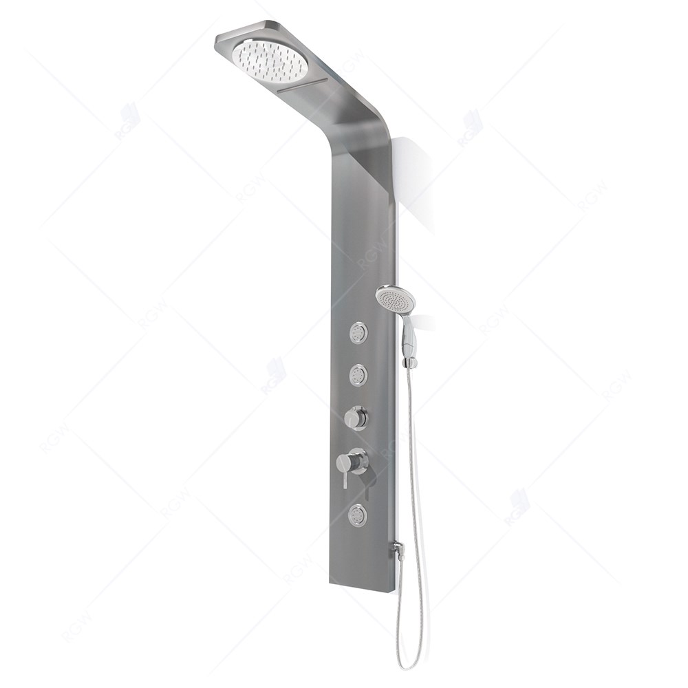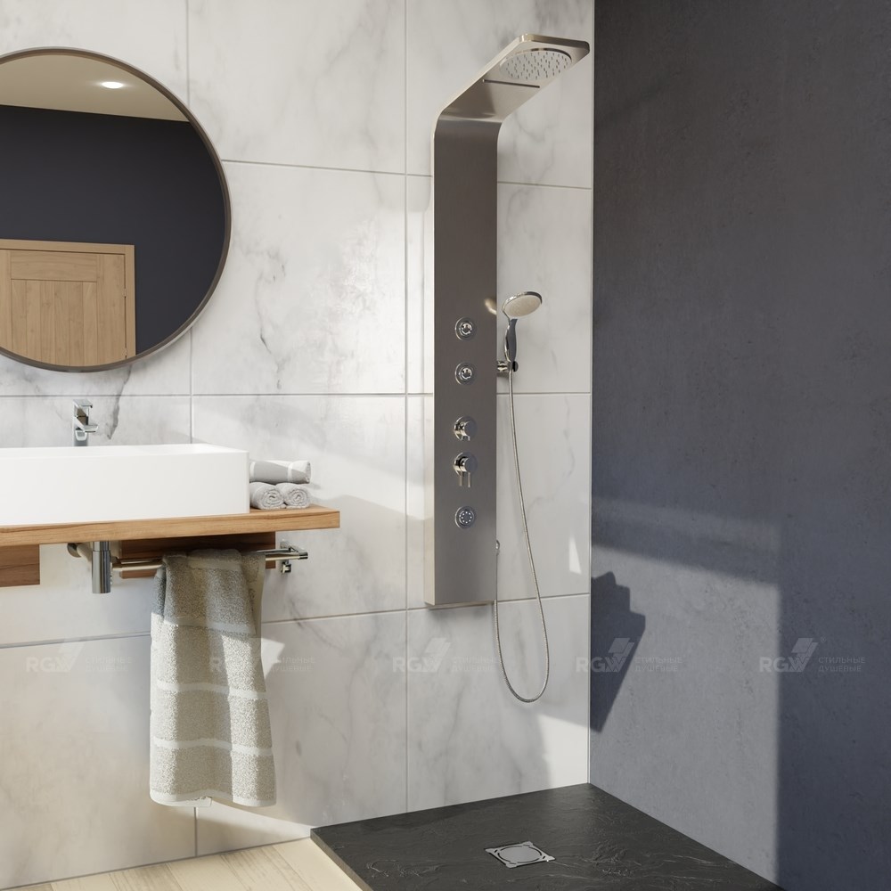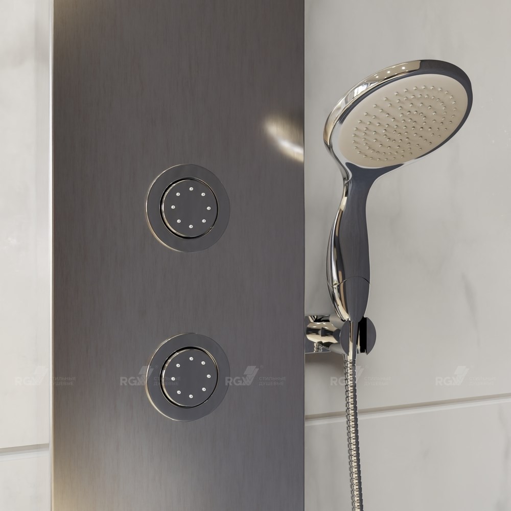 Душевая панель с гидромассажем. Нержавеющая сталь. Матовый хром. Смеситель с дивертором 4 режима. Верхний душ нержавеющая сталь. Водопад. 3 гидромассажные форсунки из ABS. Ручной душ ABS 1 функция. Держатель ручного душа ABS. Шланг для душа из нержавеющей стали 1,5 м. Подключение гибкая подводка 1/2 дюйма.