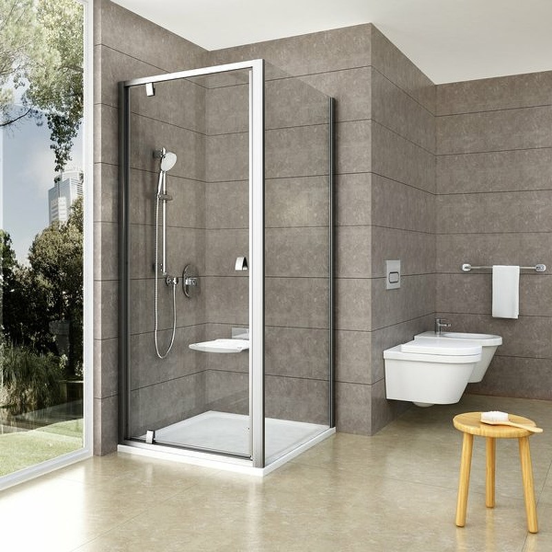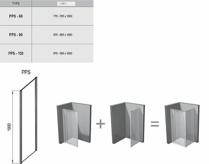 Комбинация двух неподвижных стенок и душевых дверей PIVOT позволяет создать „П“-образный душевой уголок. Регулирующий профиль PNPS позволяет расширить изделие на 20 мм, что дает возможность душевым дверям идеально адаптироваться под строительные неровности до 4 cм в каждую сторону.