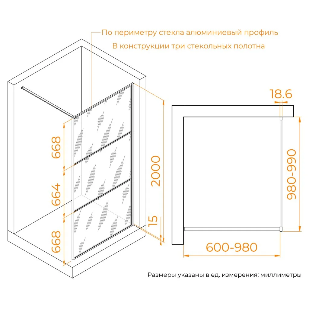 Душевая перегородка состоит из 3-х стекольных полотен (8мм), которые обрамлены изящным анодированным алюминиевым профилем!