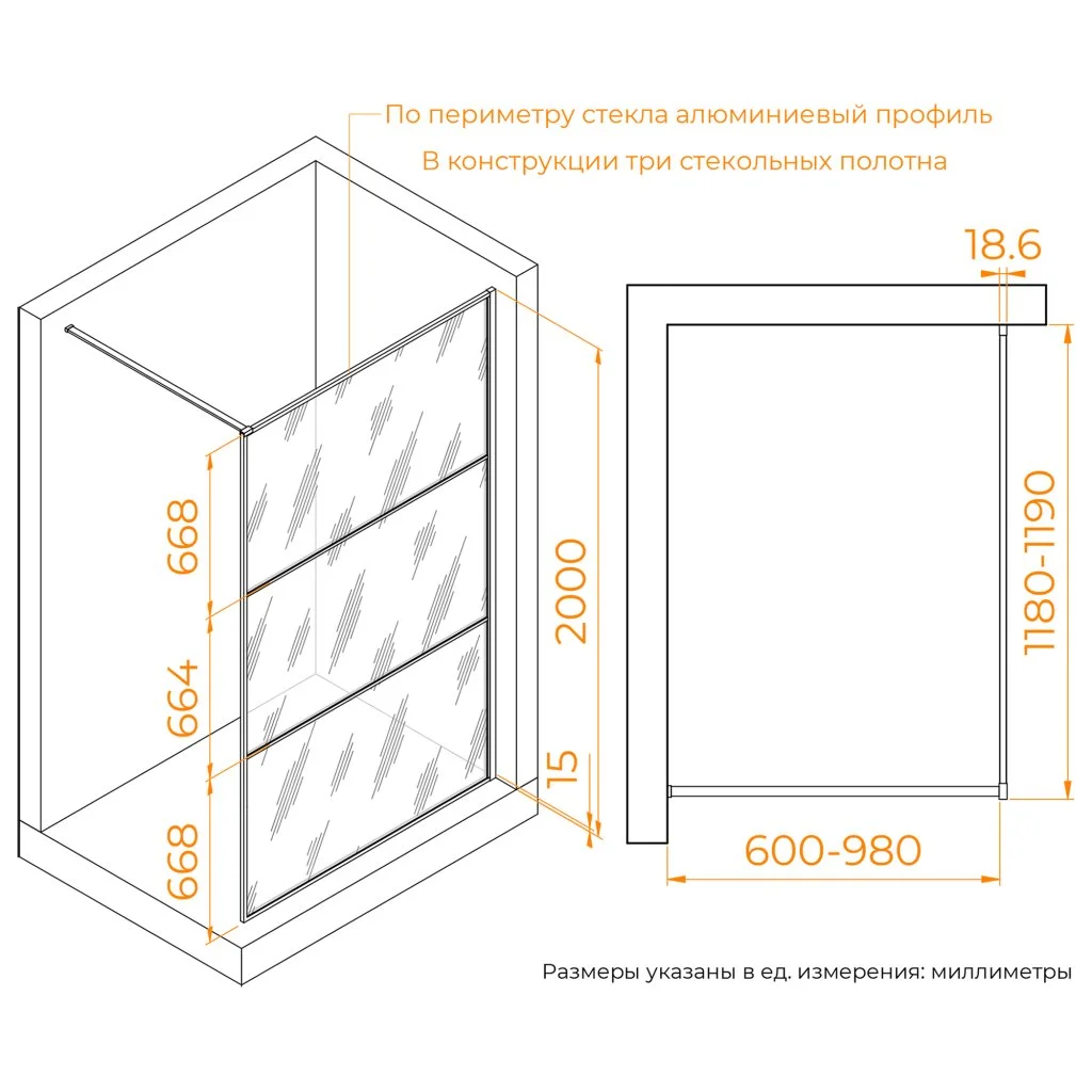 Душевая перегородка состоит из 3-х стекольных полотен (8мм), которые обрамлены изящным анодированным алюминиевым профилем!