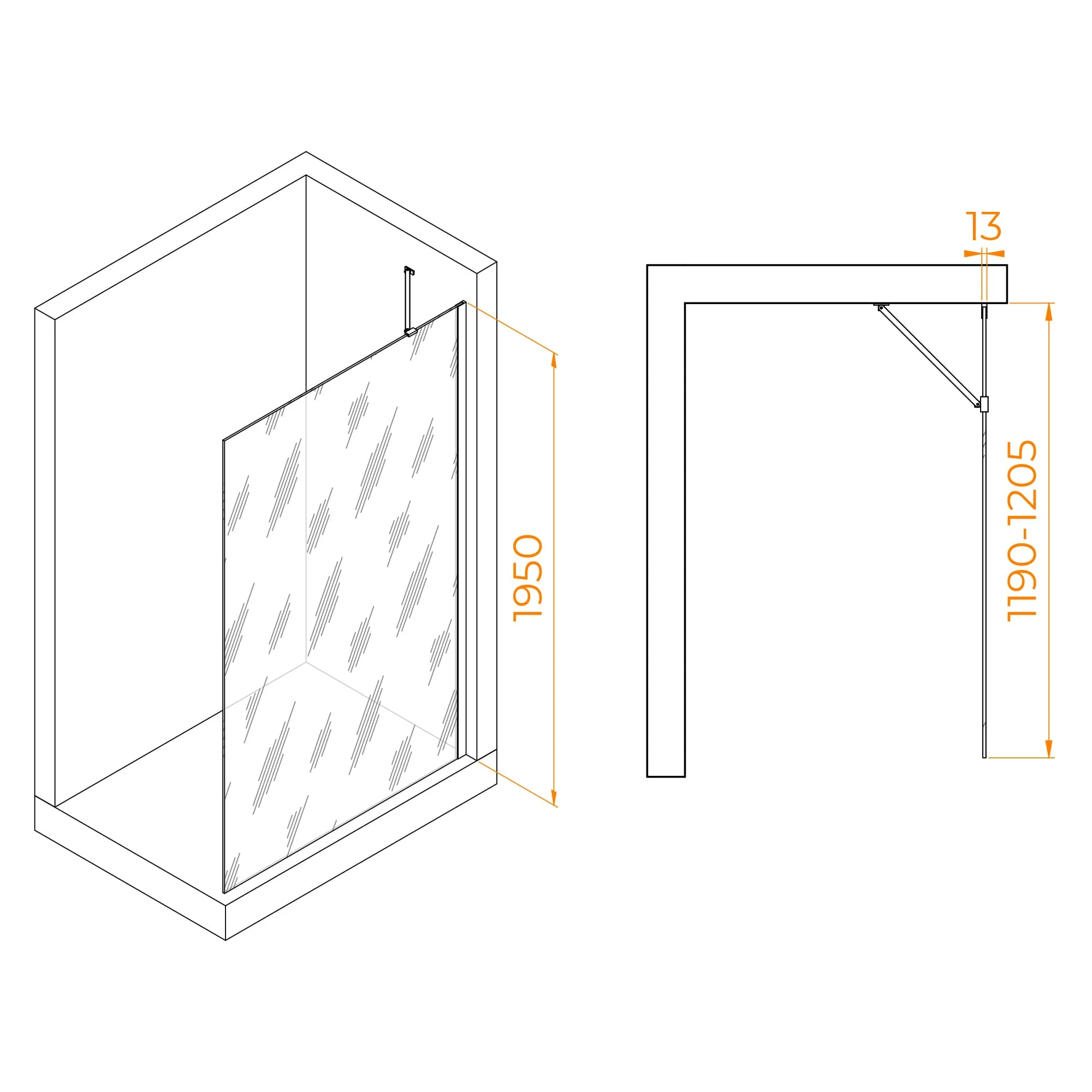 Толщина стекла данной перегородки составляет 8 мм, что делает ее очень прочной и надежной в использовании. Прозрачное стекло позволяет сохранить свет и пространство в ванной комнате, а черный цвет профиля придает ей элегантный и современный вид.