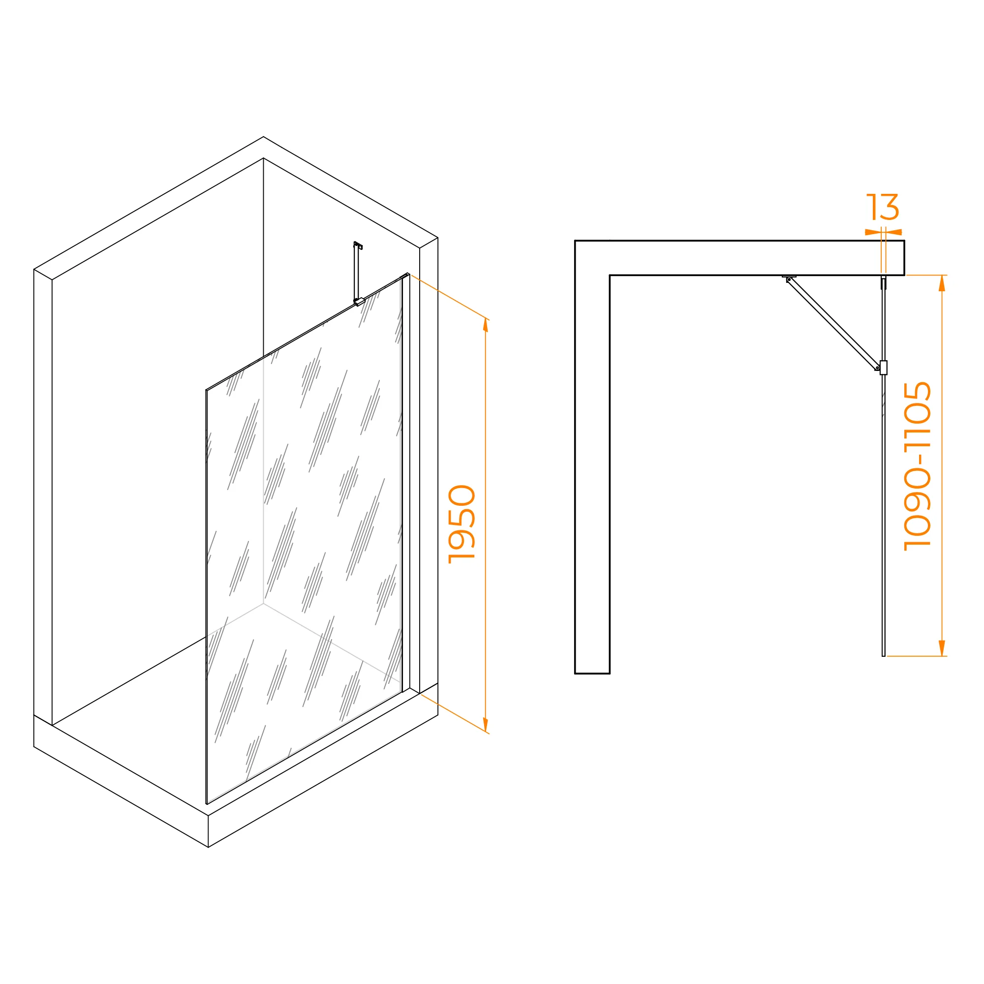 Толщина стекла данной перегородки составляет 8 мм, что делает ее очень прочной и надежной в использовании. Прозрачное стекло позволяет сохранить свет и пространство в ванной комнате, а черный цвет профиля придает ей элегантный и современный вид.