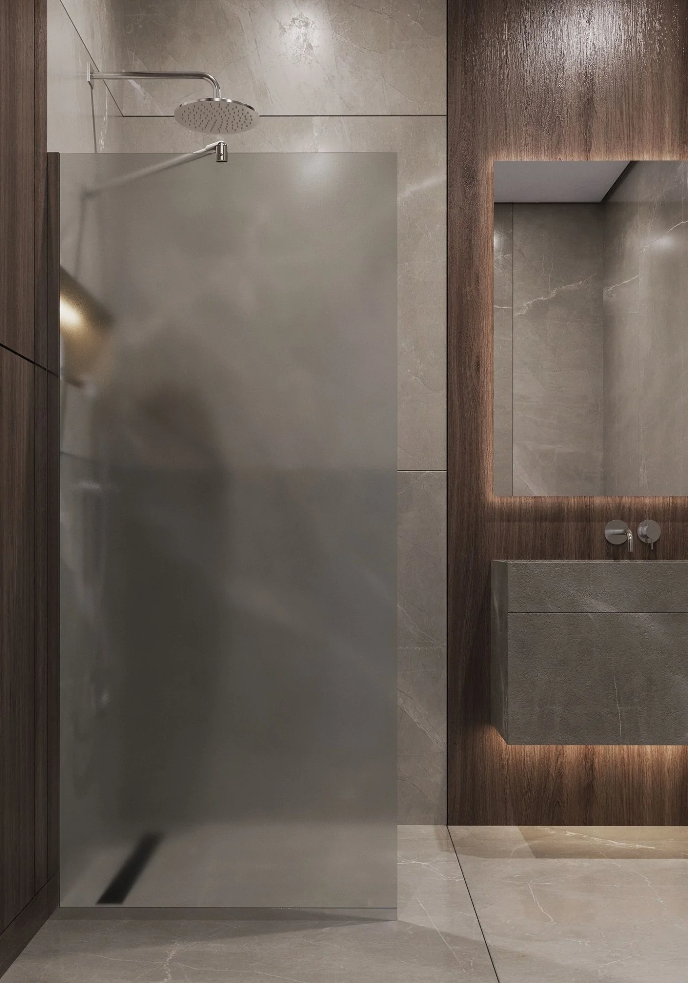 стекло матовое, толщина 8 мм, 1950x890-1 шт, Профиль П-образный , хром глянец-2шт, Штанга стена-стекло -1 шт, Комплект крепежа-1 шт, Инструкция по монтажу-1 шт