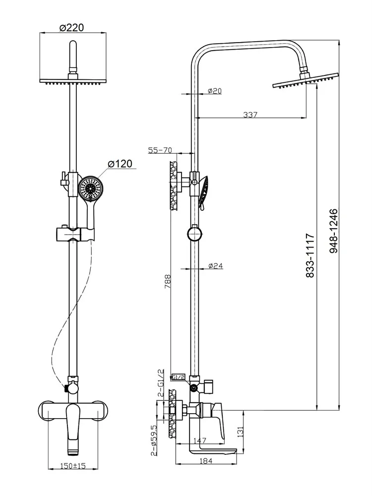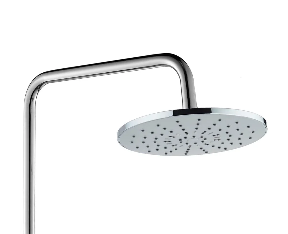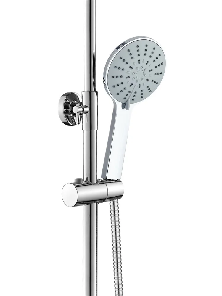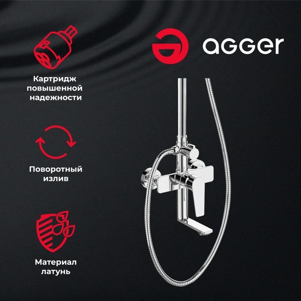Agger Brilliant A0393300 Душевая система со смесителем для ванны/душа (керамический картридж, поворотный излив 18,4 см): пятирежимный ручной душ 120 мм с регулируемым по высоте и наклону держателем, верхний душ 200 мм с регулировкой угла наклона и силиконовыми наконечниками (защита от известкового налета), телескопическая штанга, шланг 150 см с защитой от перекручивания.