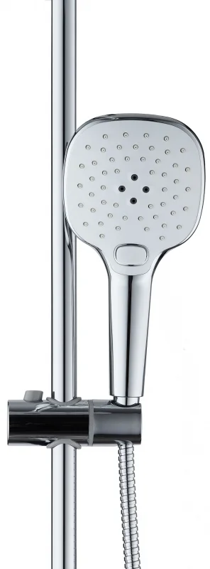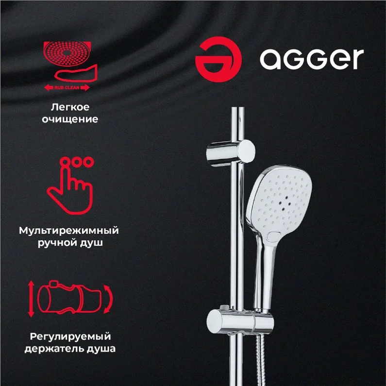 Душевая система Agger Marine в цвете глянцевый хром: верхний душ (240х240 мм) создаёт эффект тропического дождя, что дарит непередаваемые эмоции во время ежедневных банных процедур. Ручной душ 120х120 мм (3 режима) на гибком полутораметровом шланге (в металлической оплетке) с защитой от перекручивания. Держатели верхнего и ручного душа с регулировкой угла наклона, штанга 970 мм с подвижным держателем (возможность установки в старые отверстия). В комплекте также переключатель потоков и пластиковая мыльница. Подвижные детали отличаются долговечностью. Форсунки верхнего и ручного душа с функцией легкого очищения от известкового налета.