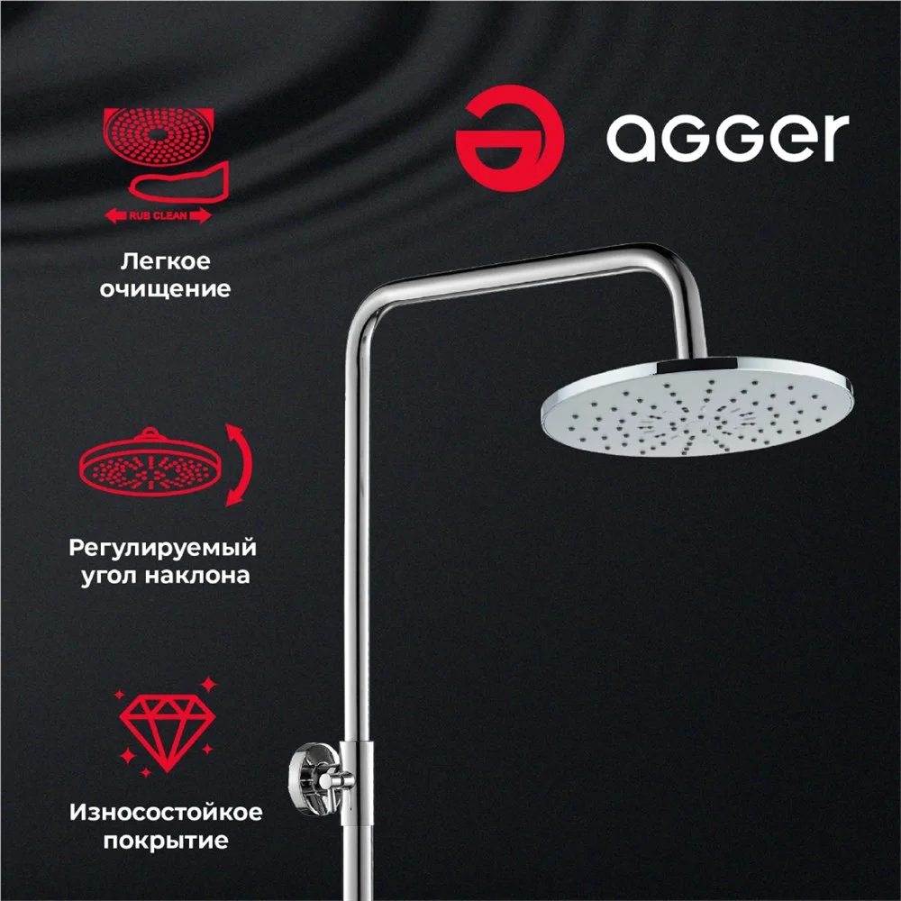Душевая система Agger Merry оснащена эргономичным однорычажным смесителем (керамический картридж) с изливом (11,7 см). Верхний душ (d 200 мм., с регулировкой угла наклона) создаёт эффект тропического дождя, что дарит непередаваемые эмоции во время ежедневных банных процедур. Ручной душ (3 режима) на гибком полутораметровом шланге в металлической оплетке (с защитой от перекручивания). Вся система обеспечивает стабильный и интенсивный напор. Подвижные детали отличаются долговечностью. В комплекте держатель лейки на штанге с возможностью регулировки угла наклона, штанга телескопическая.