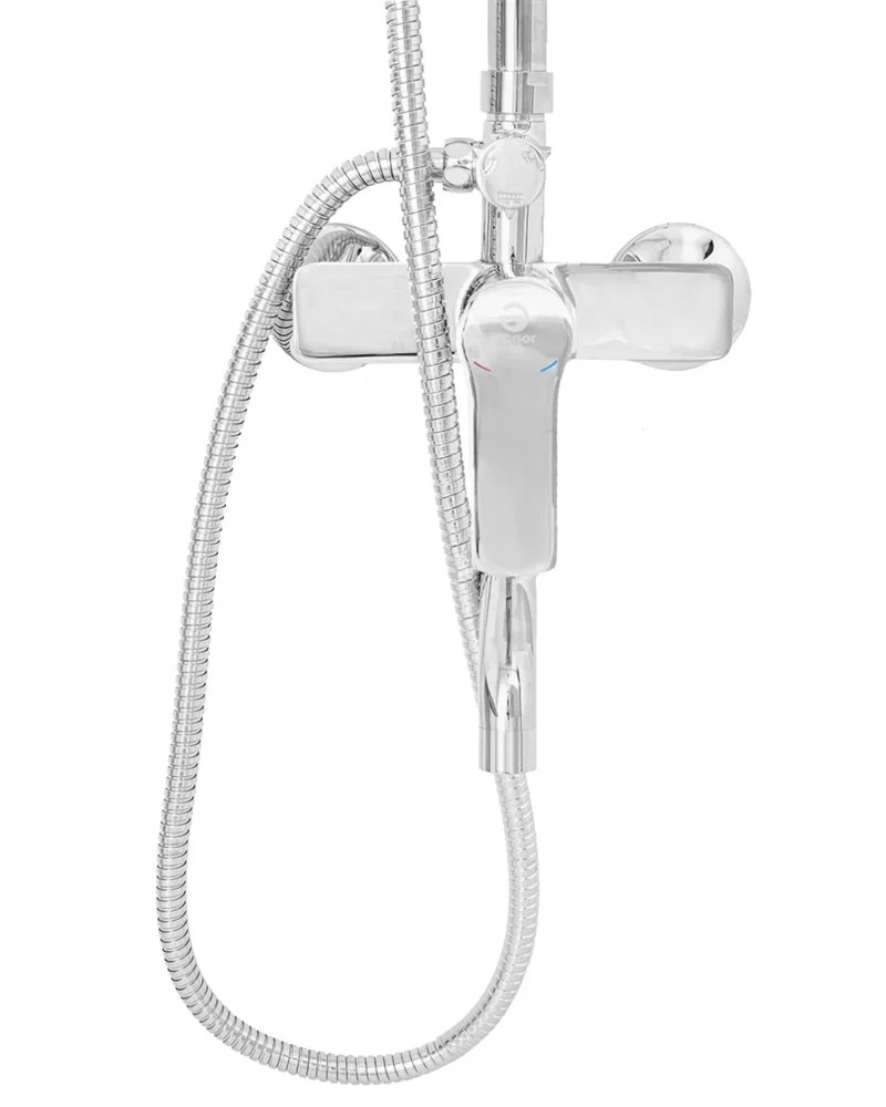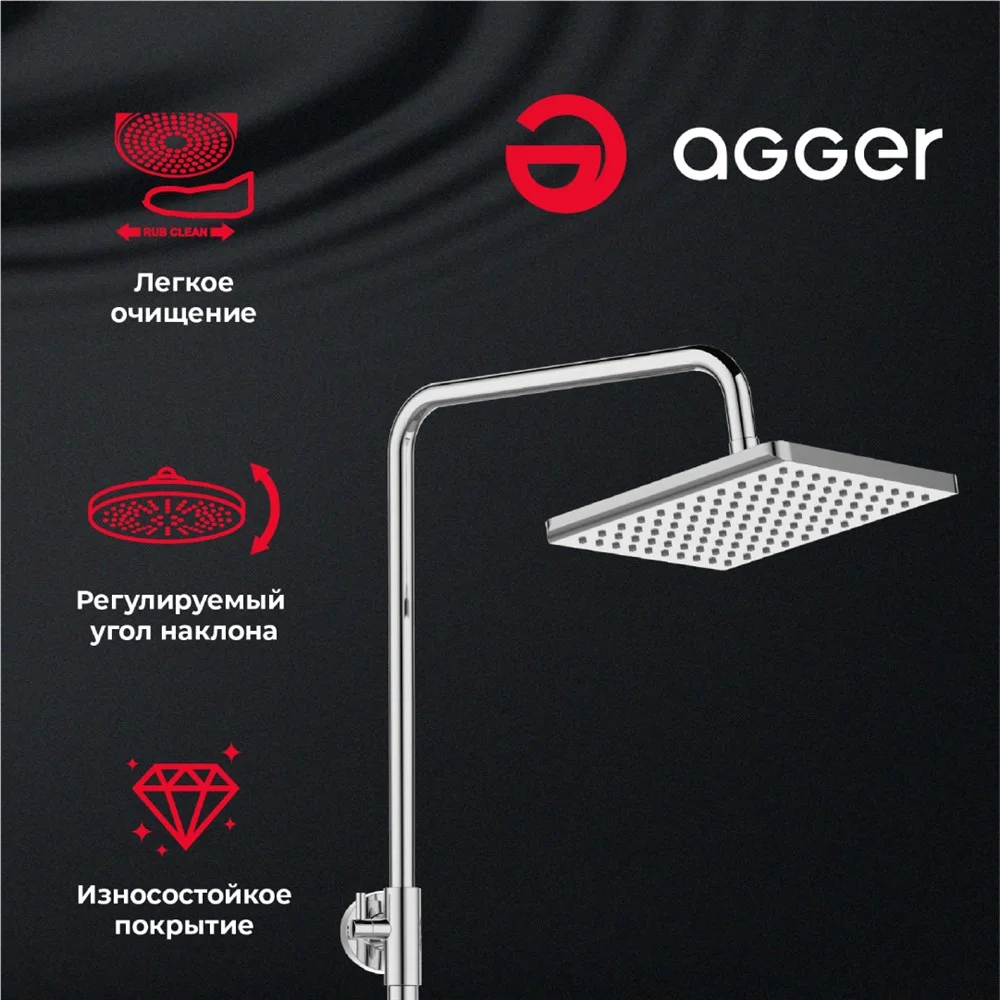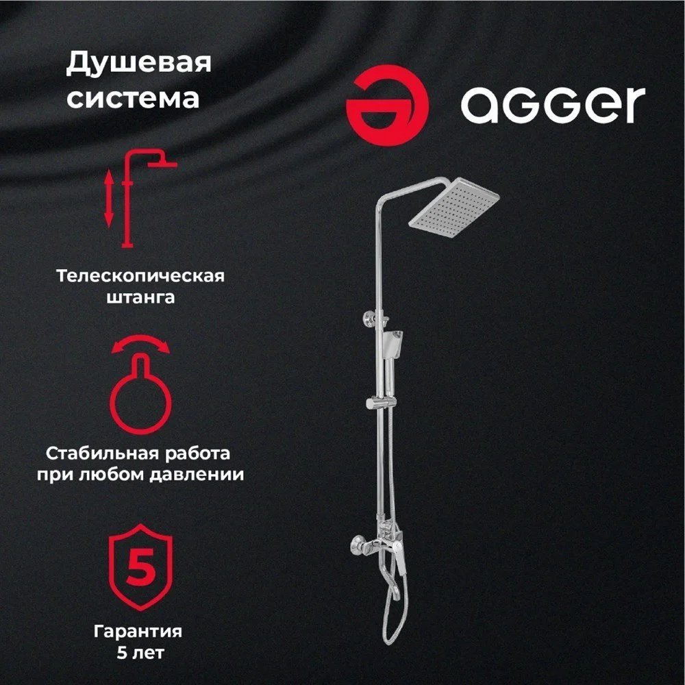Душевая система Agger Merry в цвете глянцевый хром: верхний душ (215х215 мм) создаёт эффект тропического дождя, что дарит непередаваемые эмоции во время ежедневных банных процедур. Ручной душ 95х100 мм (1 режим) на гибком полутораметровом шланге (в металлической оплетке) с защитой от перекручивания. Держатели верхнего и ручного душа с регулировкой угла наклона, телескопическая штанга 800-1200 мм. Смеситель однорычажный (керамический картридж) с поворотным изливом (117 мм). Подвижные детали отличаются долговечностью. Аэратор, форсунки верхнего и ручного душа с функцией легкого очищения от известкового налета.