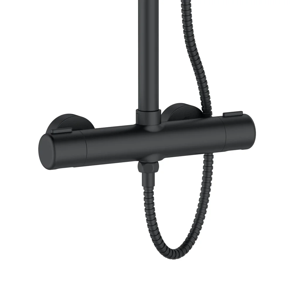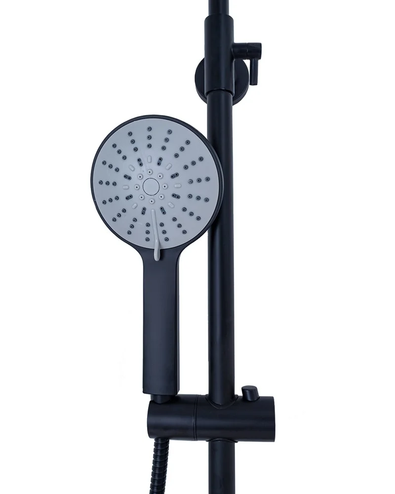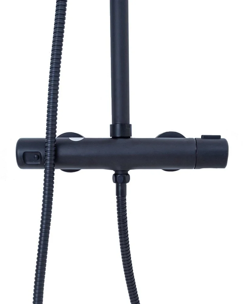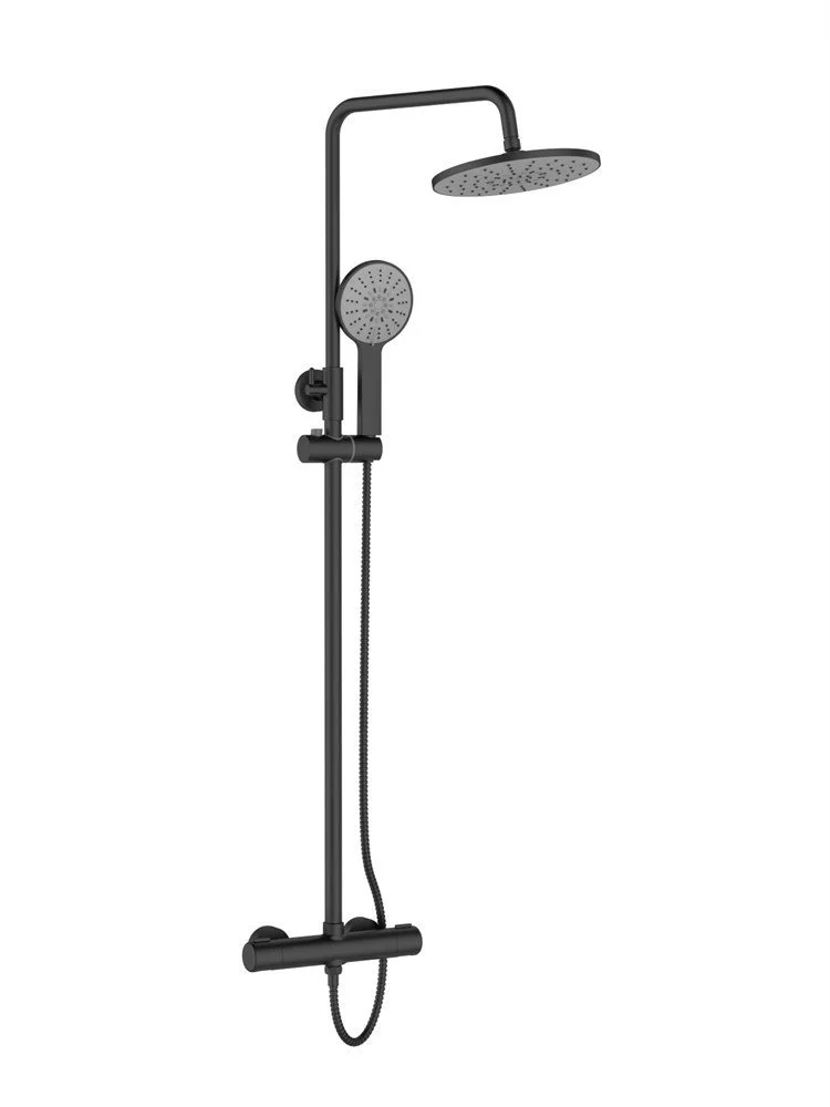 Душевая система Agger Thermo A2451244 прекрасно дополнит интерьер ванной комнаты в современном стиле. Управление осуществляется с помощью двух стильных ручек: левая - регулирует напор воды, правая - управляет температурой, создавая идеальные условия для принятия водных процедур. Термостат изготовлен из высококачественной латуни, не подверженной окислению от постоянного контакта с водой. Встроенный аэратор экономит воду и, обогащая её воздухом, делает струю мягкой и без брызг. Модное на сегодняшний день покрытие чёрного цвета, за которым просто ухаживать мягкой салфеткой, получено методом порошковой окраски с многоступенчатой системой подготовки и высокотемпературной обработкой. Регулируемый по высоте и наклону верхний душ (225 мм) и пятирежимная лейка доставят истинное удовольствие при принятии водных процедур (лейка и верхний душ с защитой от известкового налета). Штанга (865-1250 мм) телескопическая, держатель ручного душа с регулировкой угла наклона, шланг 1500 мм в металлической оплетке, с защитой от пере
