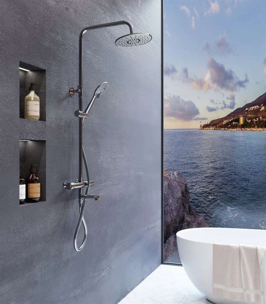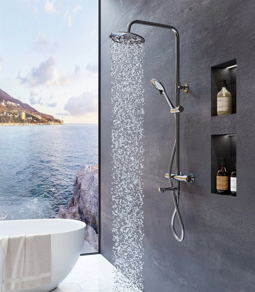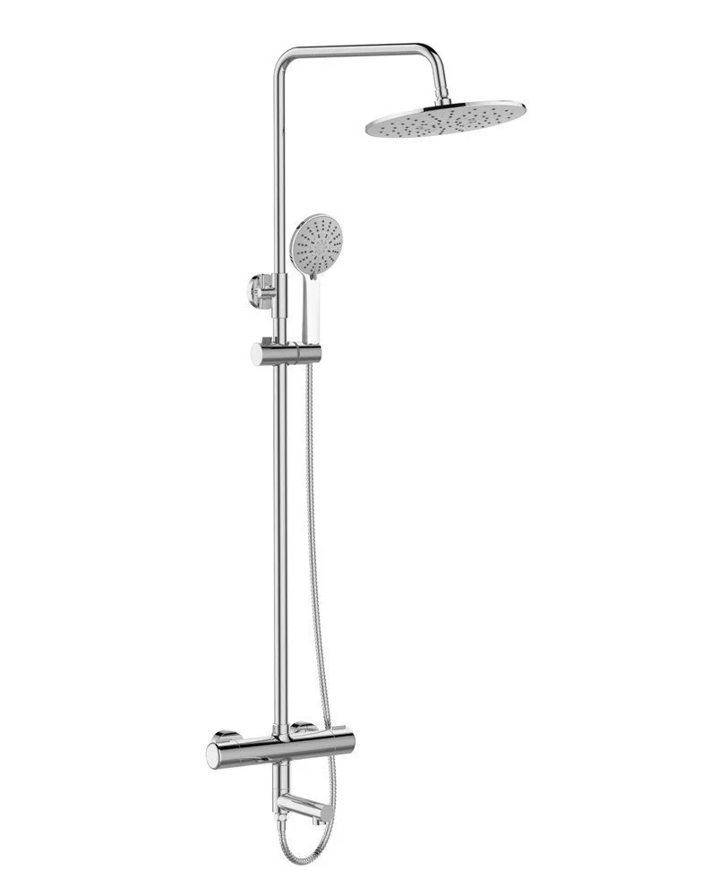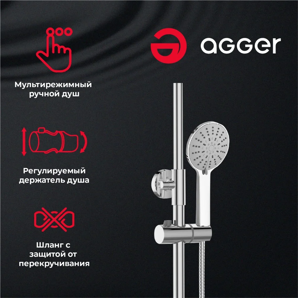 Душевая система с термостатом Agger Thermo. Термостат обеспечивает бесшумное и безупречное функционирование, регулируя перепады в системе водоснабжения и поддерживая заданную температуру. Регулируемый наклон верхнего душа до 45°, держатель ручного душа с регулировкой угла наклона и по высоте. Металлический шланг не подвержен образованию заломов, с защитой от перекручивания. Встроенный аэратор NEOPERL не только создает безупречный поток воды, но и защищает изделие от известковых отложений, увеличивая срок его службы. Хромо-никелевое покрытие не тускнеет и защищает поверхность от механических воздействий.