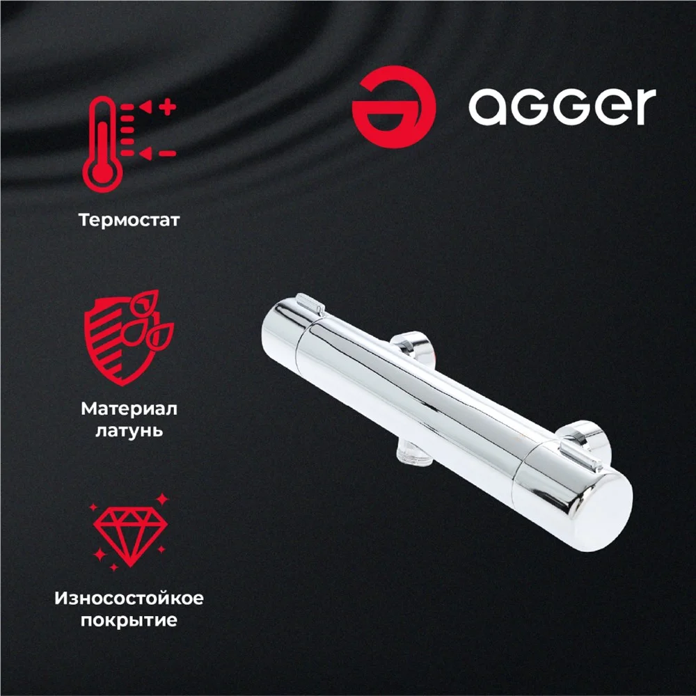 Душевая система Agger Thermo с термостатом изготовлена из первоклассных материалов с применением качественной механической фурнитуры. Верхний душ d 225 мм., душевая лейка 125 мм - 5 режимов струи, держатель лейки и верхнего душа - с регулировкой угла наклона, душевой шланг в металлической оплетке с защитой от перекручивания, пластиковая мыльница. Термостат прекрасно дополнит современный интерьер ванной комнаты. Управление происходит с помощью двух ручек: левая регулирует напор воды, а правая отвечает за температуру. По умолчанию термостат настроен на 38 °С. Чтобы увеличить температуру, нужно разблокировать ограничитель – нажмите на кнопку и вращайте дальше до желаемого эффекта. Корпус не позволит обжечься даже при максимально используемой температуре. Блеск поверхности обеспечивает зеркальный хром, за которым очень просто ухаживать мягкой салфеткой.